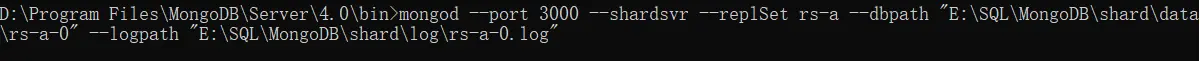 mongod --port 3000 --shardsvr --replSet rs-a --dbpath "E:\SQL\MongoDB\shard\data\rs-a-0" --logpath "E:\SQL\MongoDB\shard\log\rs-a-0.log"