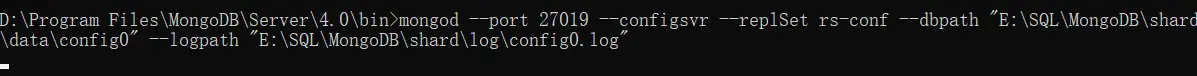 mongod --port 27019 --configsvr --replSet rs-conf --dbpath "E:\SQL\MongoDB\shard\data\config0" --logpath "E:\SQL\MongoDB\shard\log\config0.log"