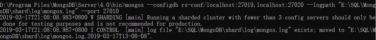 mongos --configdb rs-conf/localhost:27019,localhost:27020 --logpath "E:\SQL\MongoDB\shard\log\mongos.log" --port 27010