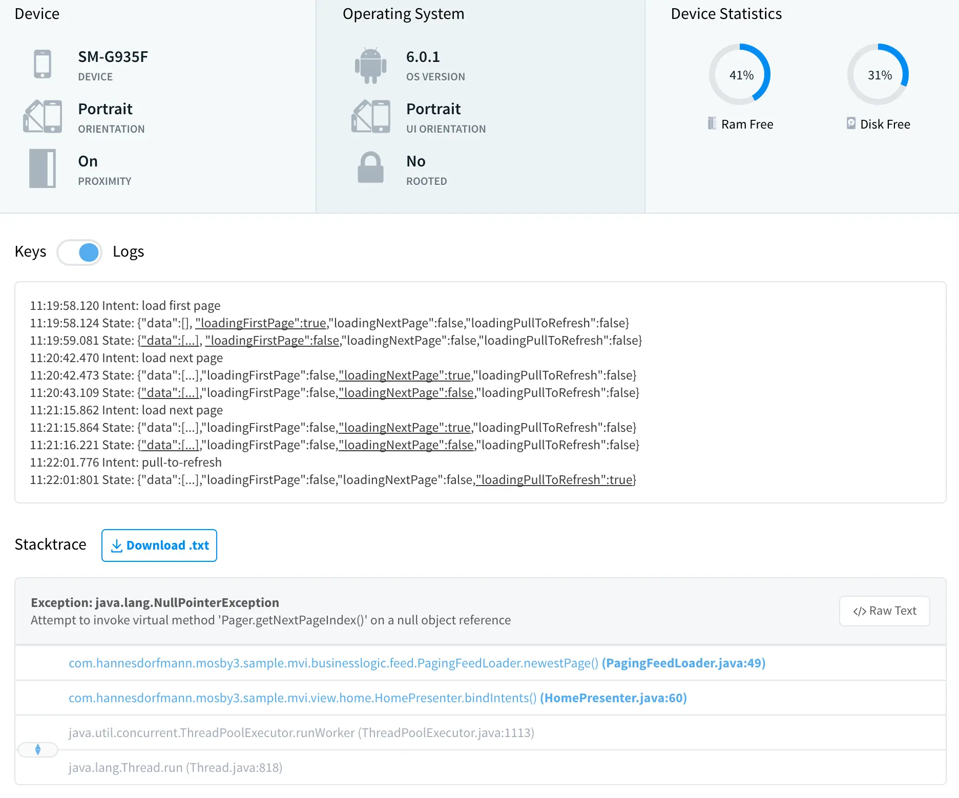 我们将view的状态序列化为json字符串,现在,我们的崩溃报告变成了这样: