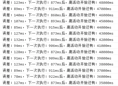 console.log("误差:" + offset + "ms,下一次执行:" + nextTime + "ms后,离活动开始还有:" + ms + "ms");