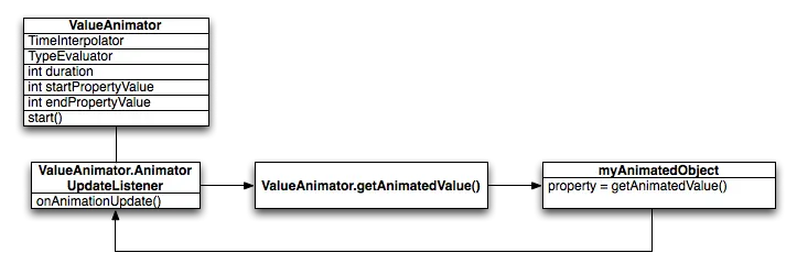 | 4 | ObjectAnimator | 属性动画的一种,主要用于根据起始值和终止值产生动画,并将动画产生的值设置在目标对象上 |
