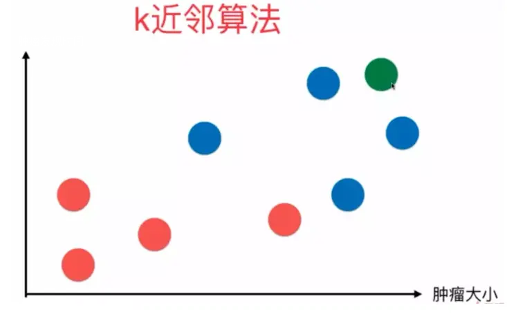 - 取K = 3,也就是离它最近的3个点,发现都是蓝色,那么很不幸的,这位同志很有可能患有恶性肿瘤。