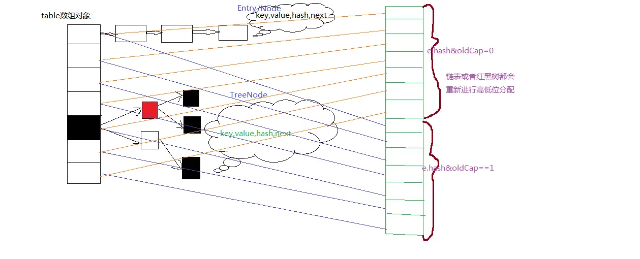 由于在扩容的时候,直接是在原来的基础上*2,即左移一位,因此可以理解为,扩容后的最高位要么为1(扩容2倍,数组长度是原来的2倍),要么为0(没有扩容,即已经达到最大);即高位为0的话,索引就是原索引,是1的话,索引变为原索引+oldCap。具体重新分配逻辑为: