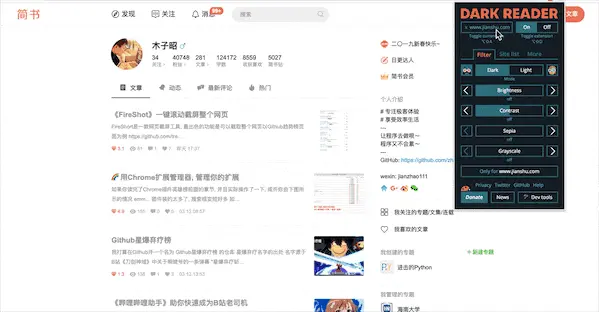 Dark Reader是一款Chrome护眼插件,可以实时生成黑色主题,为任意网站启用夜间模式