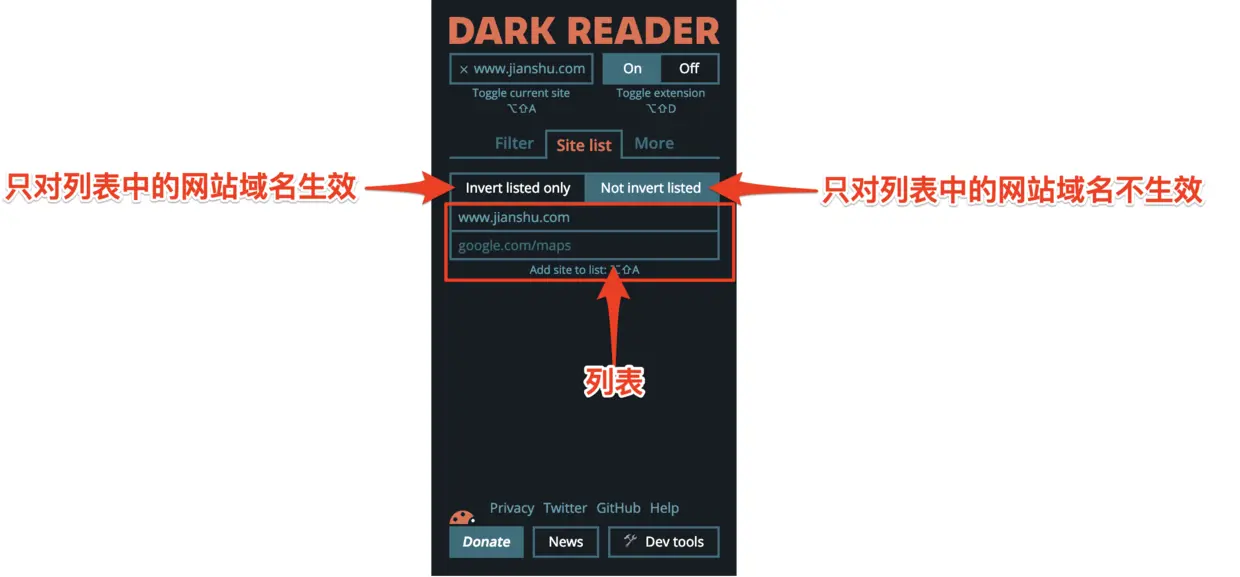 - 设置 Dark Reader 可以生效的域名网站列表