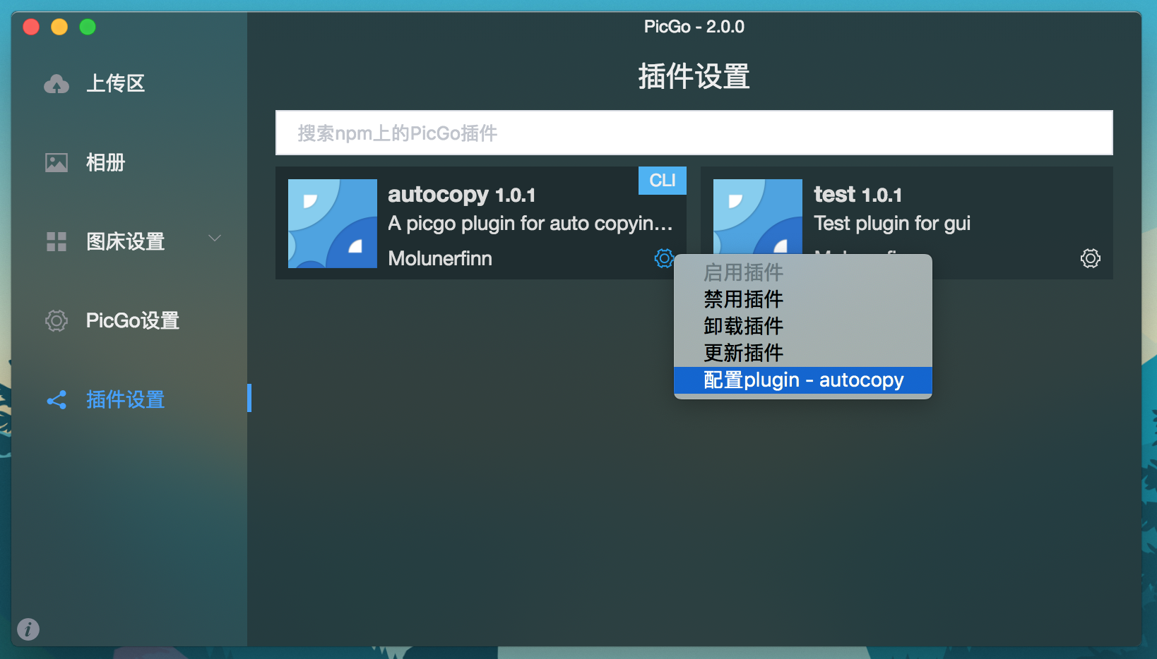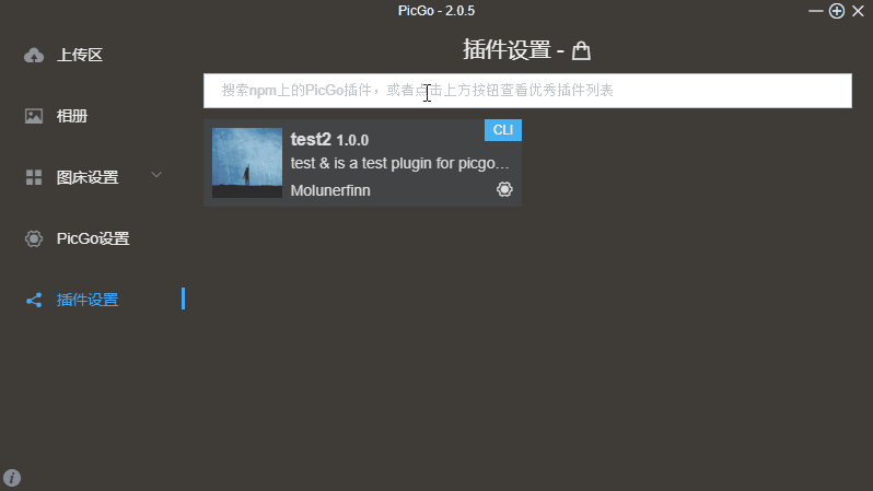 由于PicGo本质是一个上传系统,所以用户在上传图片的时候,很多插件底层的东西和功能实际上是看不到的。如果要让插件的功能更加丰富,就需要让插件有自己的「可视化」入口让用户去使用。因此对于PicGo而言,我给予插件的「可视化」入口就放在插件配置的界面里——除了给插件默认的配置菜单之外,还给予插件自己的菜单项供用户使用:
