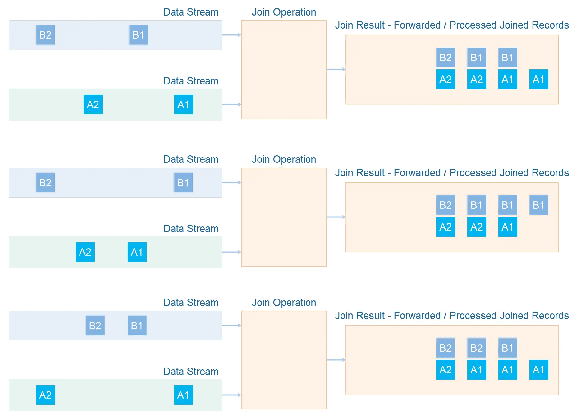 记录 A 和 B 各自被更新 2 次。这两个版本标注为 A1,A2,B1 和 B2,其中数字代表记录的版本。请注意,A1,A2,B1 和 B2 的到达时间是如何影响处理或转发时连接记录的外观的。该图显示了 3 种不同的时序排列,并且在每种情况下连接的结果看起来都不同。