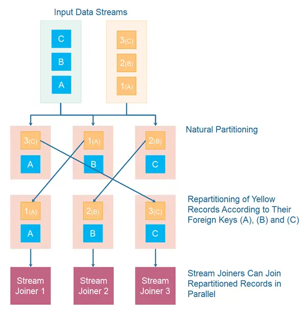 当水平扩展数据流时,数据流中的记录在不同的计算机上进行分区。要连接两条记录,要么将记录分区到同一台计算机上,要么你的连接操作必须知道如何查找存储在另一台计算机上的记录。这两个选项将在以下各节做更详细的介绍。