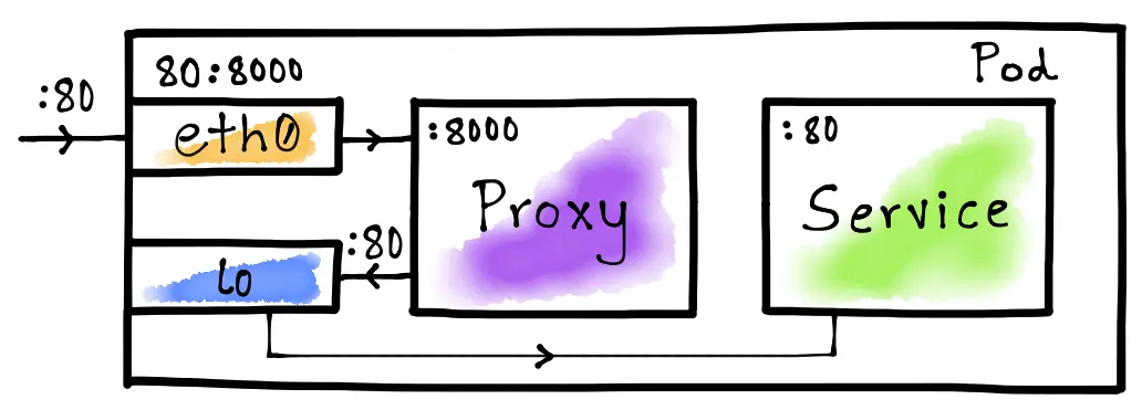 这里的想法是将eth0接口上的服务端口(80)映射到代理端口(8000)。这将确保每当容器尝试通过端口80访问服务时,来自容器外部的流量就会路由到代理。如上图所示,我们让lo接口将Pod内部流量直接路由到目标服务,即没有跳转到代理服务。