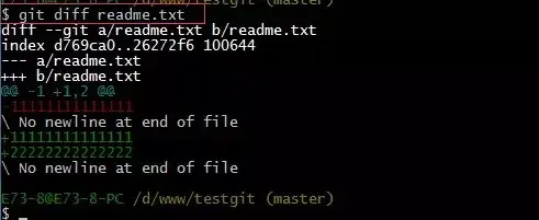 如上可以看到,readme.txt文件内容从一行11111111改成 二行 添加了一行22222222内容。