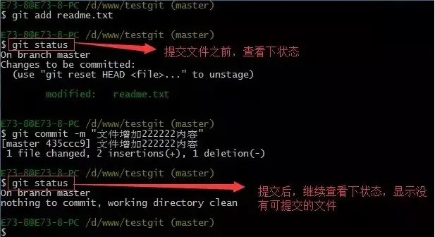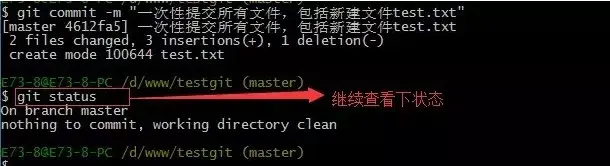 现在我们已经提交了一个readme.txt文件了,我们下面可以通过命令git status来查看是否还有文件未提交,如下: