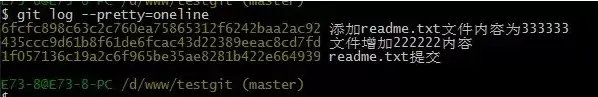 git log命令显示从最近到最远的显示日志,我们可以看到最近三次提交,最近的一次是,增加内容为333333.上一次是添加内容222222,第一次默认是 111111.如果嫌上面显示的信息太多的话,我们可以使用命令 git log –pretty=oneline 演示如下: