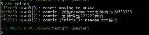 git reset --hard 版本号 ,但是现在的问题假如我已经关掉过一次命令行或者333内容的版本号我并不知道呢?要如何知道增加3333内容的版本号呢?可以通过如下命令即可获取到版本号:git reflog 演示如下: