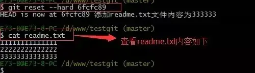 通过上面的显示我们可以知道,增加内容3333的版本号是 6fcfc89.我们现在可以命令