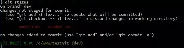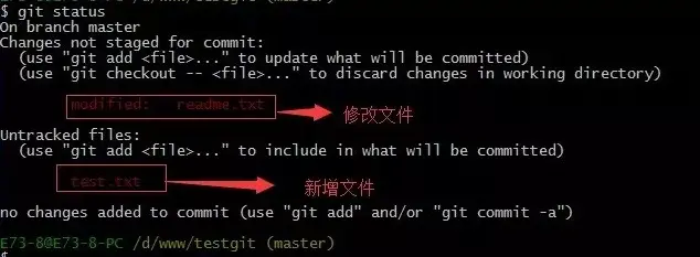 我们在readme.txt再添加一行内容为4444444,接着在目录下新建一个文件为test.txt 内容为test,我们先用命令 git status来查看下状态,如下: