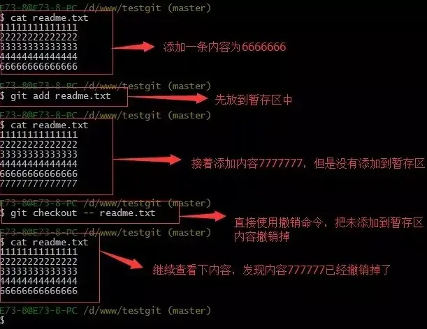 对于第二种情况,我想我们继续做demo来看下,假如现在我对readme.txt添加一行 内容为6666666666666,我git add 增加到暂存区后,接着添加内容7777777,我想通过撤销命令让其回到暂存区后的状态。如下所示: