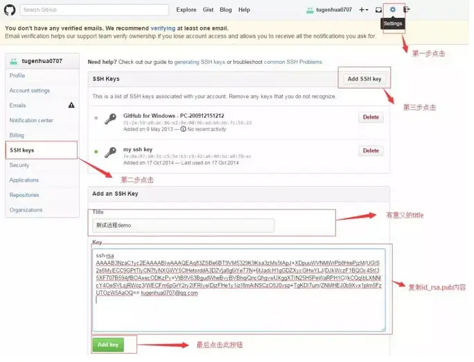 第二步:登录github,打开” settings”中的SSH Keys页面,然后点击“Add SSH Key”,填上任意title,在Key文本框里黏贴id_rsa.pub文件的内容。