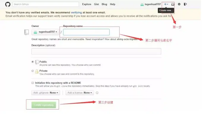 首先,登录github上,然后在右上角找到“create a new repo”创建一个新的仓库。如下: