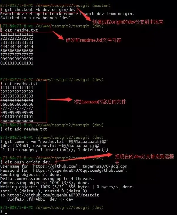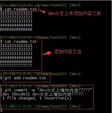 git branch查看分支,会列出所有的分支,当前分支前面会添加一个星号。然后我们在dev分支上继续做demo,比如我们现在在readme.txt再增加一行 7777777777777