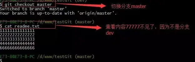 现在dev分支工作已完成,现在我们切换到主分支master上,继续查看readme.txt内容如下: