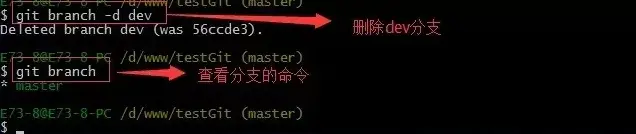 合并完成后,我们可以接着删除dev分支了,操作如下: