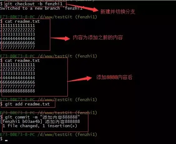 下面我们还是一步一步来,先新建一个新分支,比如名字叫fenzhi1,在readme.txt添加一行内容8888888,然后提交,如下所示: