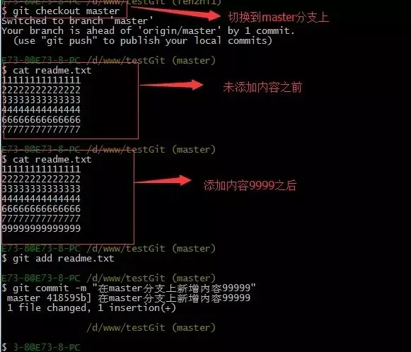 同样,我们现在切换到master分支上来,也在最后一行添加内容,内容为99999999,如下所示: