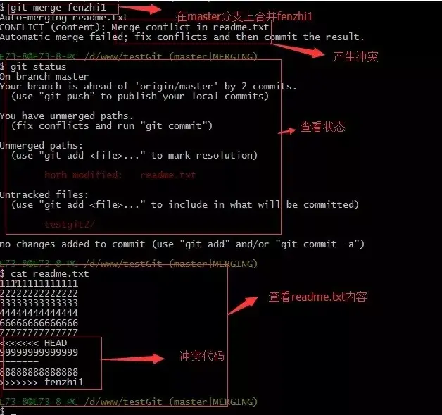 现在我们需要在master分支上来合并fenzhi1,如下操作: