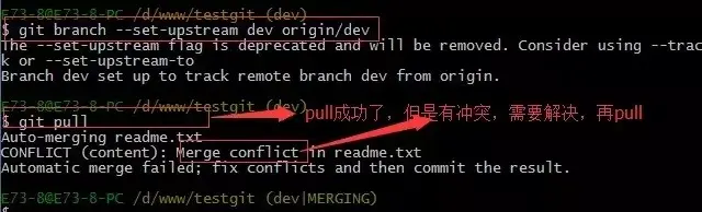 git pull也失败了,原因是没有指定本地dev分支与远程origin/dev分支的链接,根据提示,设置dev和origin/dev的链接:如下: