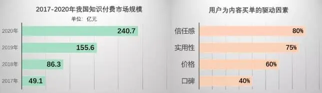 可以看到,用户知识付费接受度和习惯正不断被养成,他们对好内容的付费情绪更加狂热,各平台输出优质内容的价值变得越来越高,不再停留于流量红利带来商家广告收益的层面,而是直接上升到了“流量=潜在收益+必然收益”的层面。