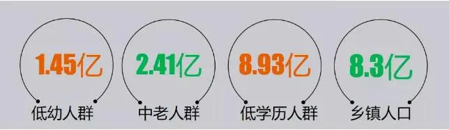 其次,部分场景已成一片红海,为可持续发展各内容创业者们将深入挖掘新的场景。据企鹅智库和韭菜财经大数据显示,我国现有1.45亿低幼人群、2.41亿中老人群、8.93亿低学历人群和8.3亿乡镇人口。