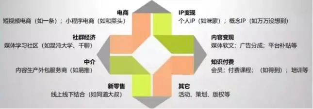 受此局限,内容创业者们开始依附于内容、流量等外来资源,向电商、知识付费、IP、中介等领域延伸,交错繁多的链条因此形成了一个变现生态池。其中践行者就有,知识付费的得到、短视频变现的一条、内容电商的大鱼号、IP变现的万万没想到等。