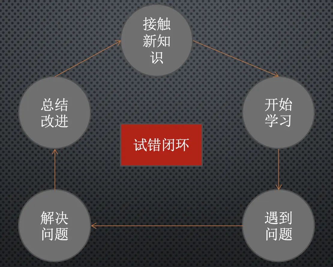 当然,我自学那会还没有人告诉我这些,更没有人给我分享什么自学的方法和技巧,所以,我基本上遇到了在自学中会遇到的大部分问题,可以说,我的自学就是这样的一个状态,或者说更像是一个试错闭环