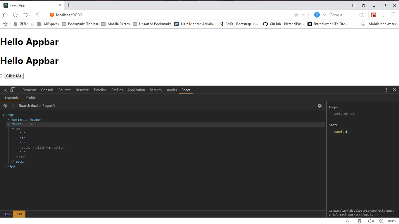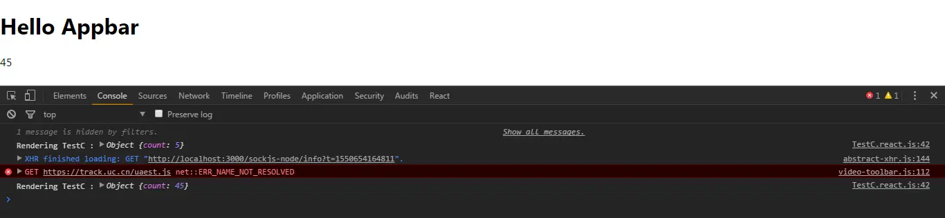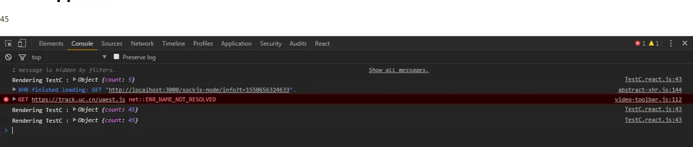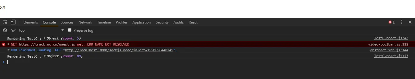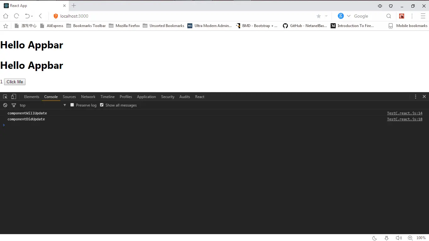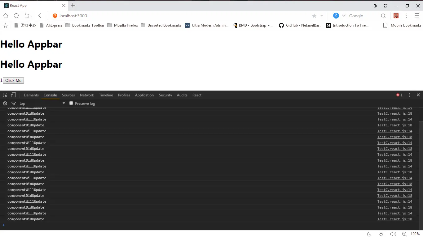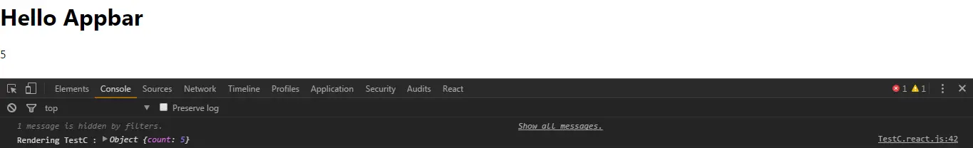 TestC组件有一个本地状态count,它的初始值是0(state = {count: 0})。当我们点击Click Me按钮时,count的值被设置为1。这时候屏幕的数字将会由0变成1。当我们再次点击该按钮时,count的值还是1, 这时候TestC组件不应该被重新渲染,可是现实是这样的吗?