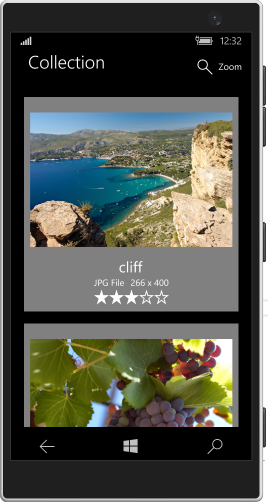 <VisualStateManager.VisualStateGroups> <VisualStateGroup> <!-- Add a new VisualState for mobile devices --> <VisualState x:Key="Mobile"> <!-- Trigger visualstate when a mobile device is detected --> <VisualState.StateTriggers> <local:MobileScreenTrigger InteractionMode="Touch" /> </VisualState.StateTriggers> </VisualState> </VisualStateGroup> </VisualStateManager.VisualStateGroups>这些资源库会将图像库的 ItemTemplate 设置为我们在第一部分中创建的新 DataTemplate,并将命令栏和缩放滑块与屏幕底部对齐,以便拇指能够在手机屏幕上更加轻松地触及。