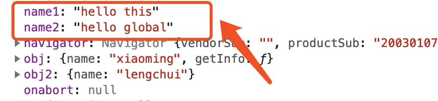 console.log(this.name2); // 输出:"hello global"
