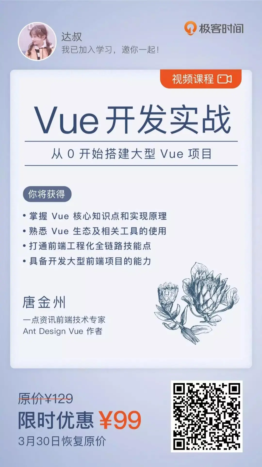 很多粉丝留言问我市面上有没有靠谱的学习资料,今天介绍一位朋友——唐金州,他最近在极客时间开设了《Vue开发实战》视频课,不同于市面上大多数教程,这门课程除了讲解 Vue 的核心知识点及实现原理,在整个学习周期,金州还会带你基于 Vue 去开发一个完整的大型开源项目 Ant Design Pro,从开发、测试、打包构建到最终的上线,并努力将它打造成一个万星项目。