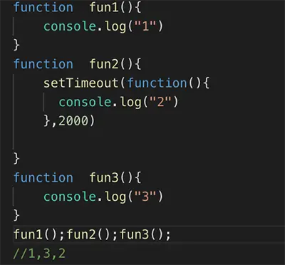 定义三个函数,fun2利用setTimeout实现异步函数,执行结果分别是1,3,2