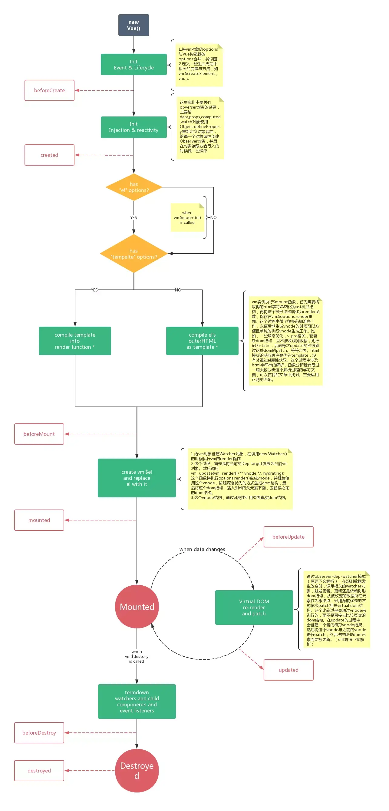这篇文章在于总结前段时间对于Vue源码的粗略学习,大致讲述一个简单的vue实例从创建到更新再到销毁的过程。涉及Vue从html结构到ast对象;再从render函数到virtual dom;以及vue的核心Observer + dep + Watcher对象所构成的数据驱动视图更新的逻辑;以及最后更新页面所涉及的diff算法等等。Vue博大精深,小子由衷敬畏和仰慕。能力有限,各方面均是个人肤浅认知。记录一些个人学习理解心得,有不当的地方请指正。