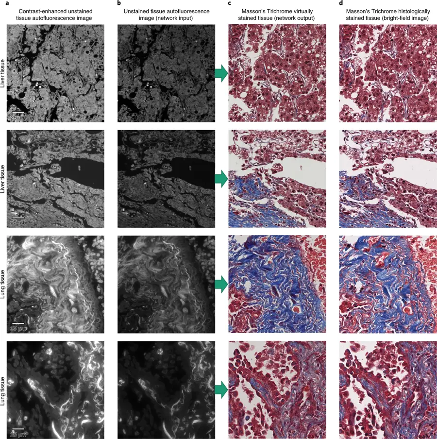 第一列是增加对比度的图像,第二列是原始自荧光图像,第三列是 AI 虚拟染色,第四列是一种传统的方法:Masson 三色染色。针对的是肝和肺的切片样本。