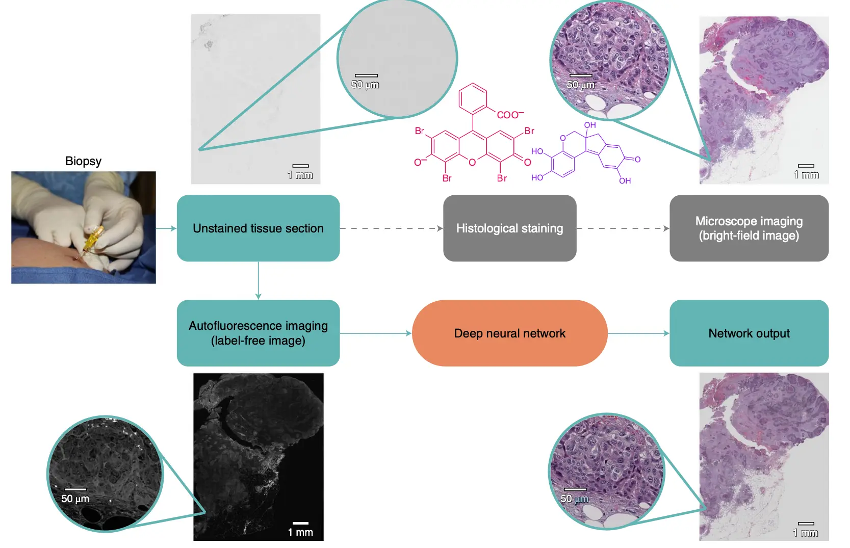 虚拟图像染色利用了机器学习的方法,通过使用之前染色的资料,用深度卷积神经网络( CNN )对样品的单个自发荧光图像进行上色。