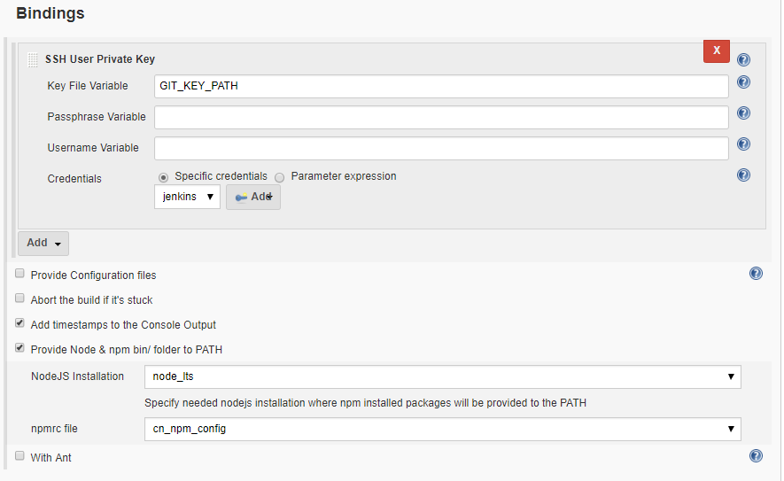 Build Environment 选项页面配置任务所需的环境,这里由于由于 hexo deploy 时需要 push 静态页面到 coding,也需要之前 git 仓库认证的密钥文件,可以勾选 Use secret text(s) or file(s),将密钥文件提取出来以备接下来使用。同时在这里配置 nodeJS 运行环境,并且勾选了在控制台打印信息中添加时间戳以便调试。