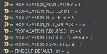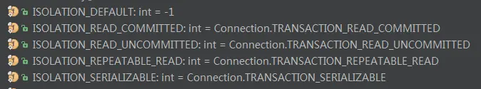在此,定义了与 java.sql.Connection 相同的四种隔离级别。此外,还定义了默认隔离级别(ISOLATION_DEFAULT ),它会使用底层数据库所定义的默认隔离级别。