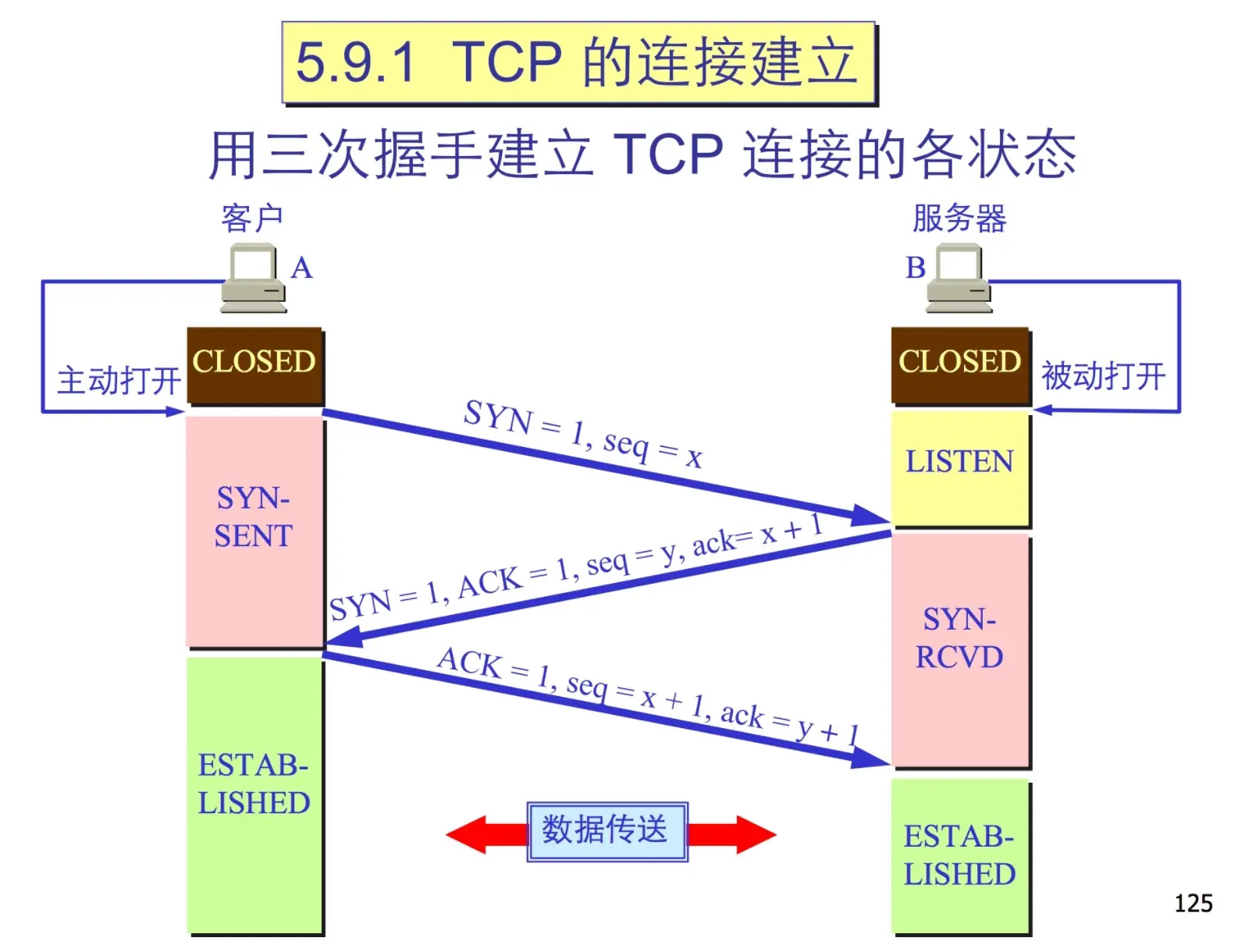 第一步:A向B发送请求报文,同步位SYN=1(表示需要返回响应),seq = x,x为要传输数据时候的第一个数据字节的序号