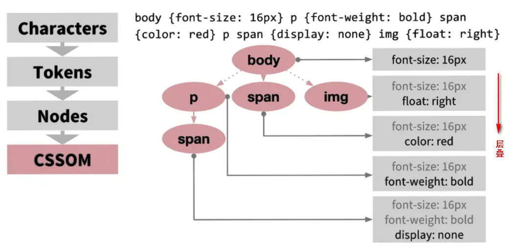 CSSOM的创建过程: 字节 => 字符 => TOken => Node => CSSOM;