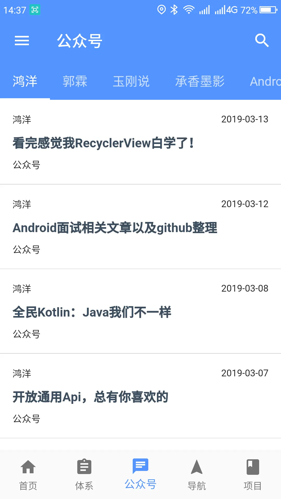 - 主要的UI包括首页轮播图和列表,体系流式布局,公众号导航TabBar,以及下拉刷新和加载更多