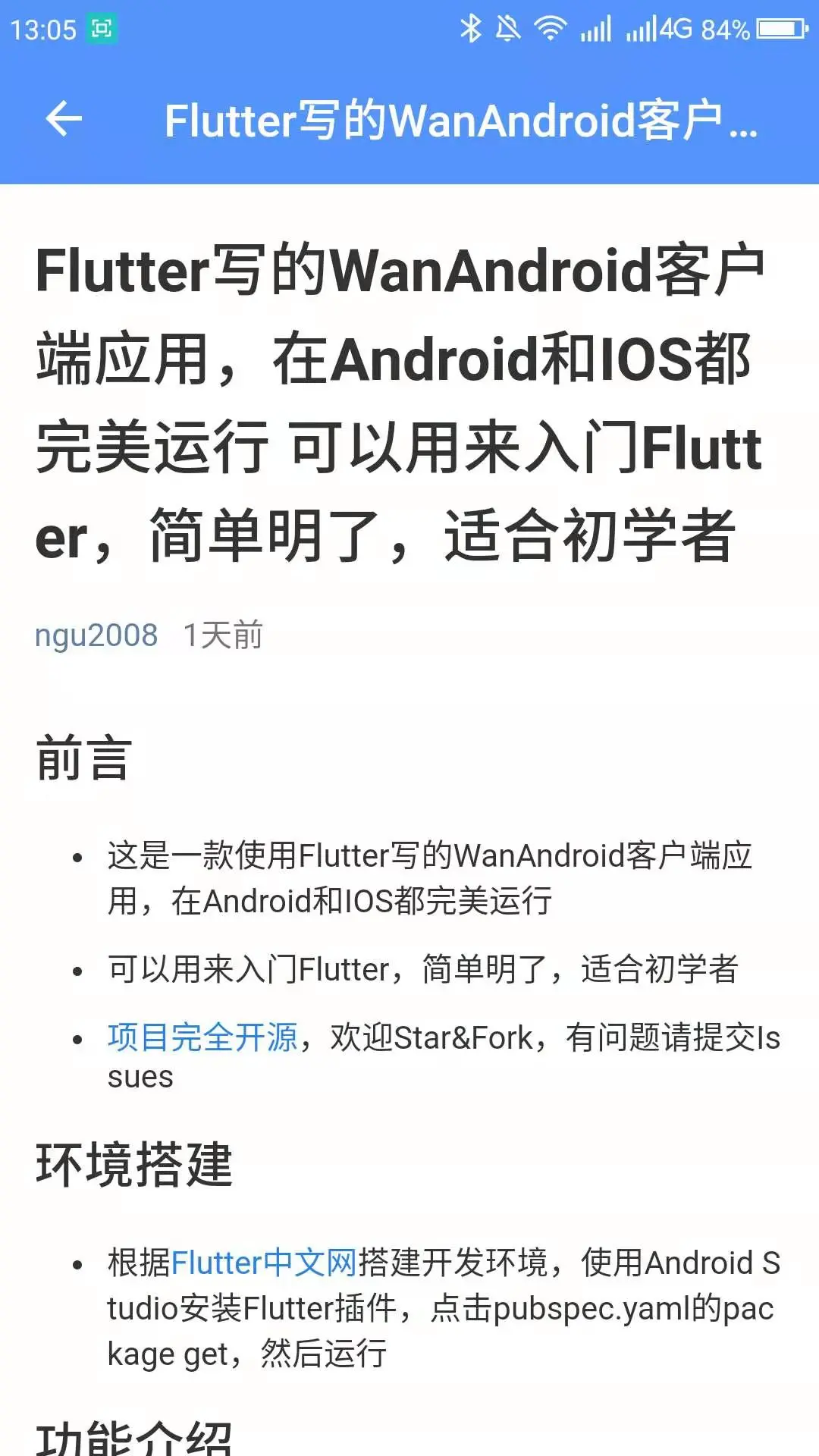 用Flutter开发的跨平台项目,完美运行在Android和IOS上,Material简洁风格,包括启动页、引导页、注册、登录、首页、体系、公众号、导航、项目,还有漂亮的妹子图库,运行极度流畅,结构清晰,代码规范,值得拥有