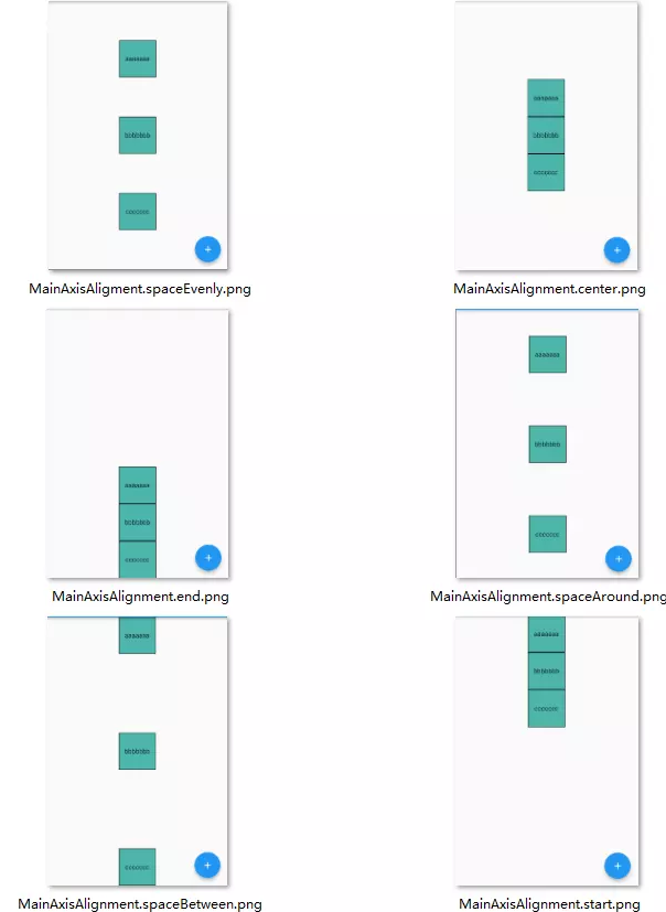 MainAxisAlignment是垂直的,默认起始位置在上边,排列方向为从上至下,此时可以通过verticalDirection来改变MainAxisAlignment的起始位置及排列方向
