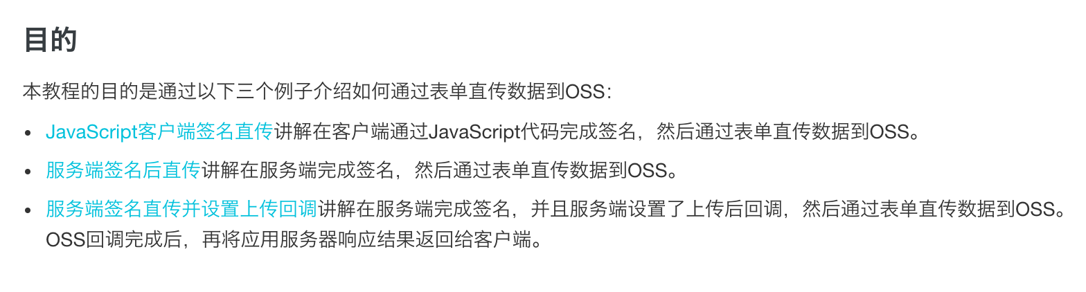 首先给大家一篇阿里云的文档 web端直传实践,它里面给出了三个上传的例子,如下图: